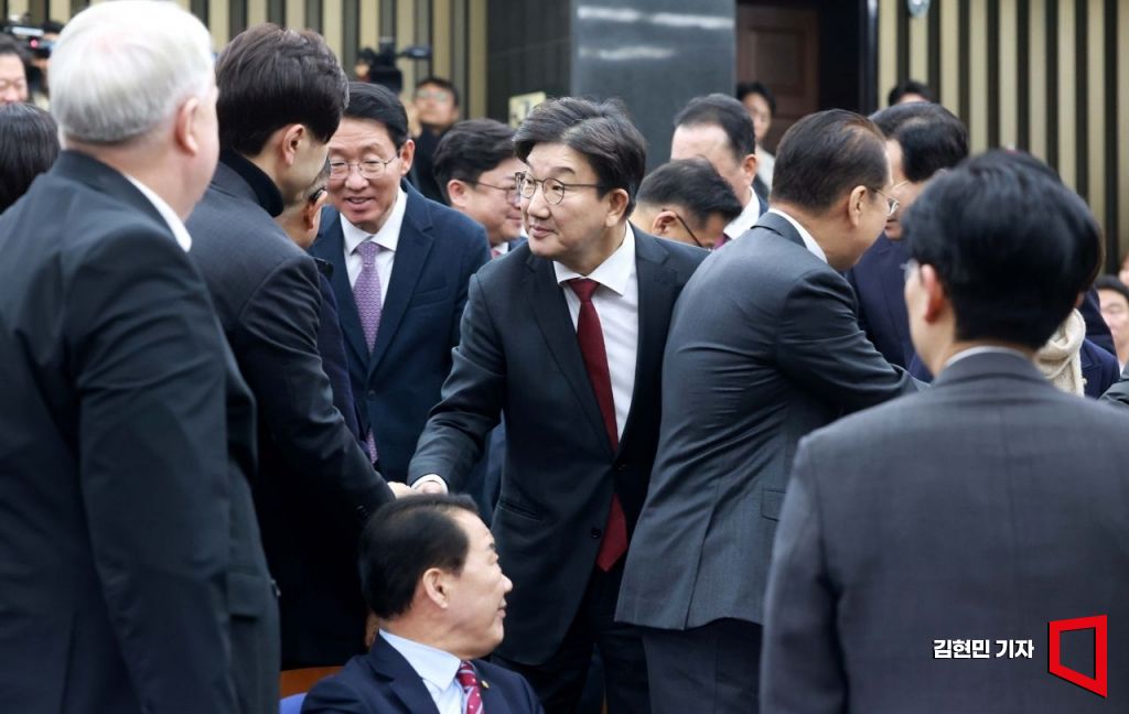 권성동 국민의힘 원내대표가 16일 국회에서 열린 의원총회에 참석하고 있다.