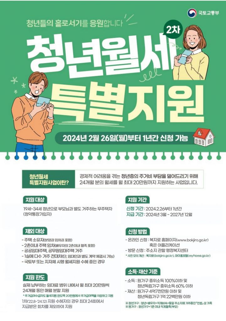 신청 자격은 부모와 별도로 거주하는 19세~34세 무주택 청년으로, 청년 가구의 기준 중위소득 60% 이하(1인 가구 기준 월 소득 143만 원 이하)와 재산가액 1억2200만 원 이하, 부모를 포함한 원가구 기준 중위소득 100% 이하(3인 가구 기준 월 소득 502만 원 이하) 및 재산가액 4억7000만원 이하 조건을 충족해야 한다.