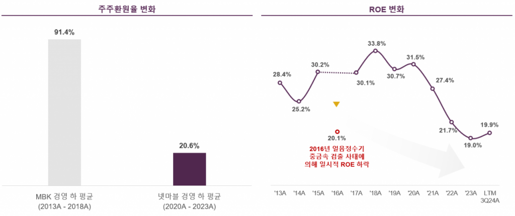 이창환 얼라인파트너스 대표는 “코웨이 저평가의 핵심 원인은 넷마블의 지분 인수 직후 이뤄진 주주환원의 급격한 감축”이라며 “주주환원율이 MBK 시절 평균 91%에서 넷마블 인수 후 20% 내외로 축소됐다”고 지적했다.