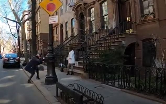 미국 드라마 '섹스앤더시티' 촬영지인 뉴욕 맨해튼의 한 아파트 앞에서 관광객들이 사진을 찍고 있다. 유튜브 캡처, 연합뉴스