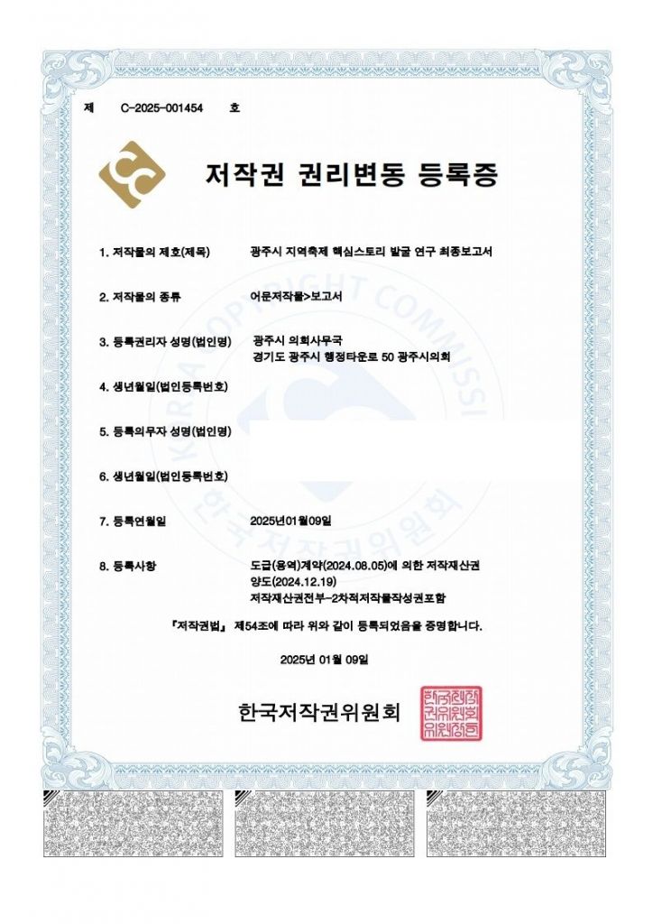 저작권 권리변동 등록증. 경기 광주시의회 제공