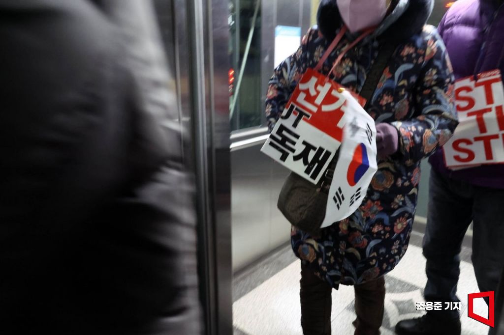 지난 1월 3일 아침 윤석열 대통령에 대한 체포영장 집행을 위해 공수처 관계자들이 서울 한남동 대통령 관저에 들어간 가운데 윤 대통령 지지자들이 관저 근처 집회장으로 가면서 태극기와 성조기, 부정선거 검증을 촉구하는 손팻말을 들고 구호를 외치고 있다. 허영한 기자