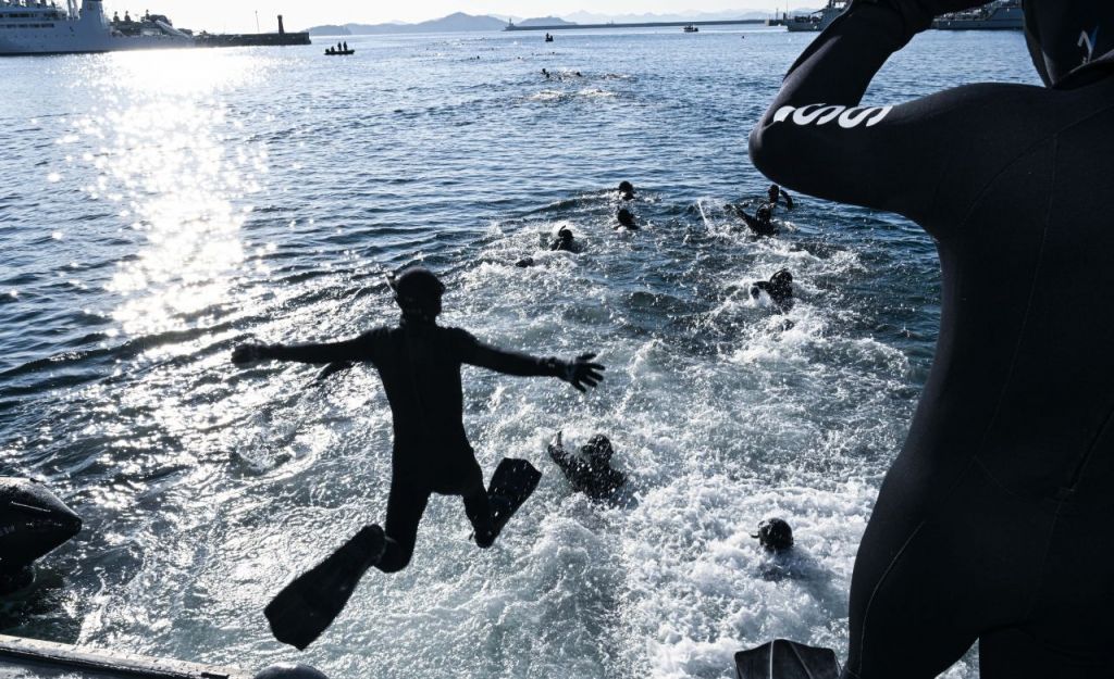 훈련 3일차인 16일 철인중대 선발경기의 한 종목인 오리발 수영에서 심해 잠수사(SSU)들이 겨울 바다로 뛰어들고 있다. (사진제공=해군)
