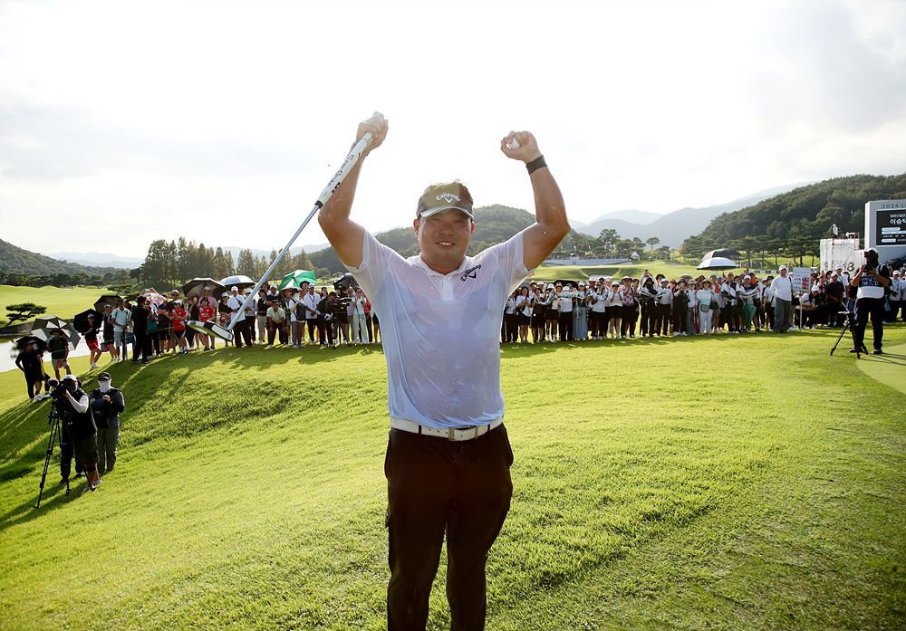 이승택이 2024 렉서스 마스터즈에서 생애 첫 우승을 확정지은 직후 환호하고 있다. 사진제공=KPGA