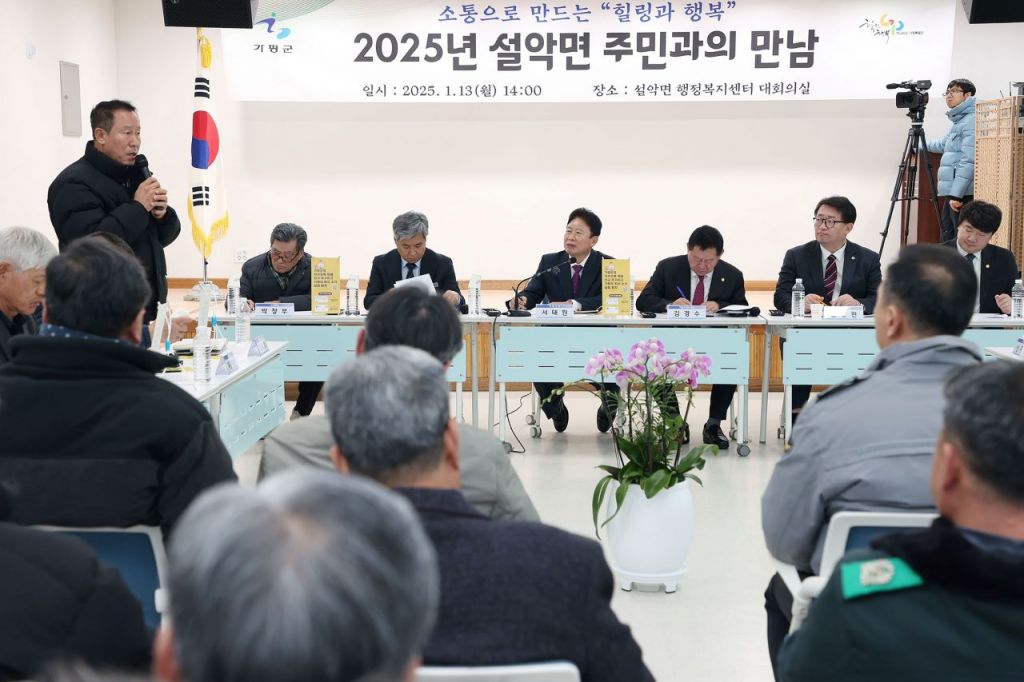 서태원 군수가 지난 13일 '2025년 설악면 주민과의 만남' 행사에 참석해 주민들의 건의시항을 청취하고 있다. 가평군 제공