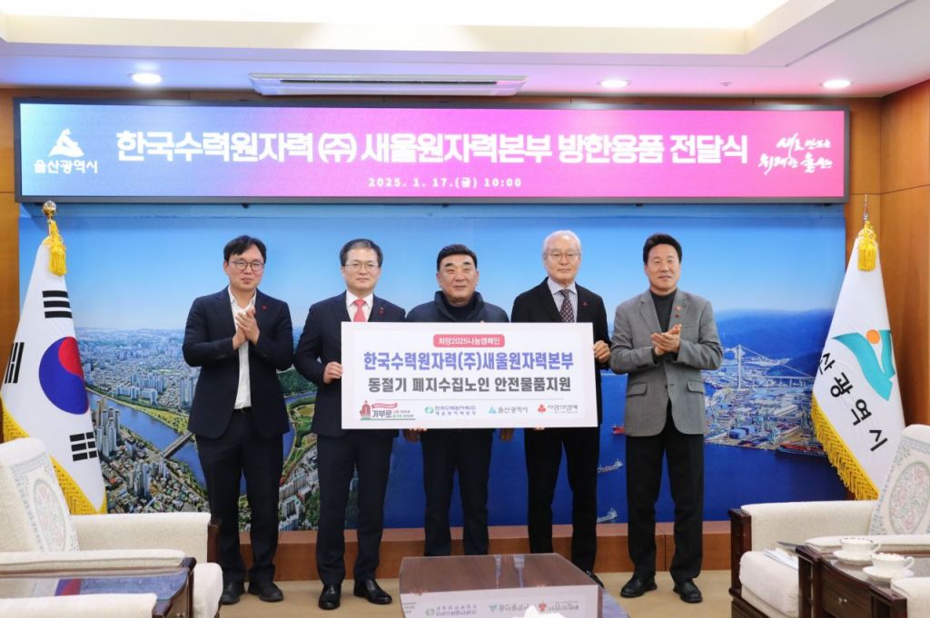 한국수력원자력 새울원자력본부는 17일 울산시청에서 김두겸 울산시장, 소유섭 새울원자력본부장이 참석한 가운데 폐지 수집 활동을 하는 어르신들을 위한 방한 안전용품 전달식을 가졌다.