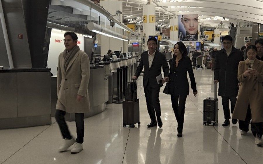 정용진 신세계그룹 회장(왼쪽)과 배우자 한지희 씨가 17일(현지시간) 뉴욕 JFK 국제공항을 통해 입국하고 있다. 정 회장은 오는 20일 워싱턴 D.C.에서 열리는 도널드 트럼프 미국 대통령 당선인의 취임식에 참석한다. 뉴욕=권해영 특파원
