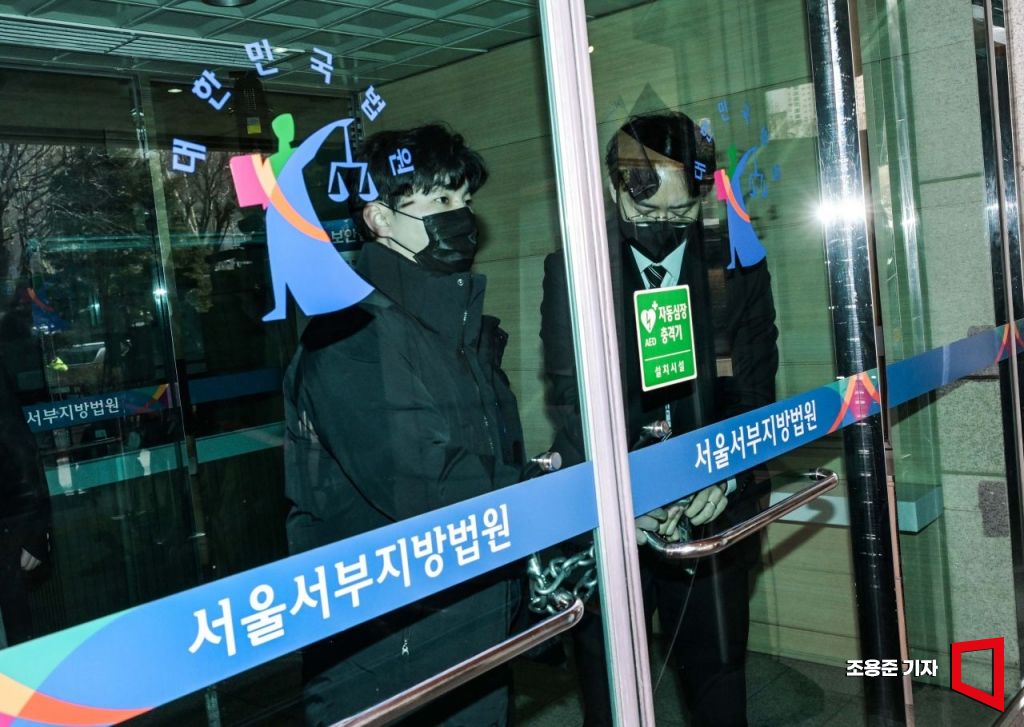 내란 우두머리 혐의로 체포된 윤석열 대통령에 대한 영장실질심사가 열리는 18일 서울 마포구 서울서부지방법원에서 윤 대통령을 태운 호송차가 지하로 내려가자 직원들이 출입문을 자물쇠로 잠그고 있다.