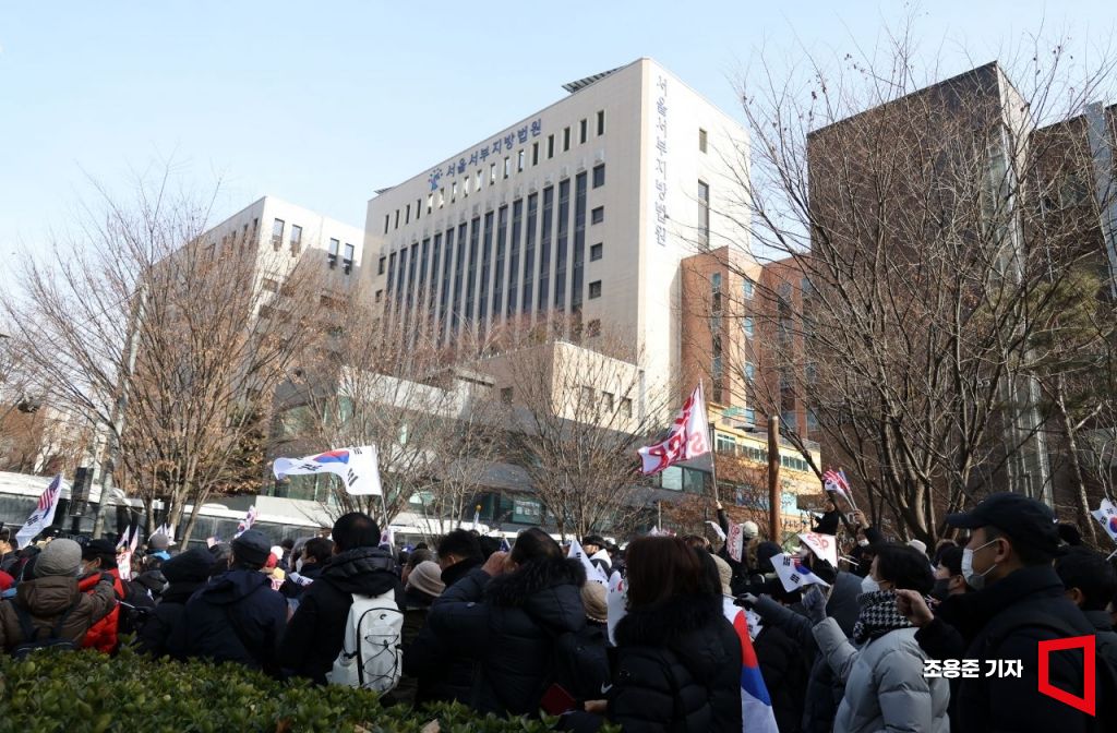 윤석열 대통령이 18일 호송용 승합차를 타고 구속 전 피의자심문(영장실질심사) 출석을 위해 서울 마포구 서울서부지법으로 들어가자 지지자들이 영장 기각을 촉구하며 함성을 지르고 있다.조용준 기자