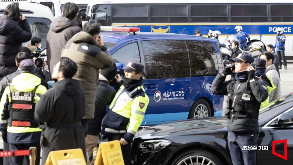 내란 우두머리 혐의로 체포된 윤석열 대통령의 구속 내란 수괴와 직권남용 등의 혐의를 받는 윤석열 대통령의 구속 전 피의자 심문(영장실질심사)이 열리는 18일 서울 마포구 서부지법에 윤 대통령이 탑승한 호송차량이 도착하고 있다. 조용준 기자