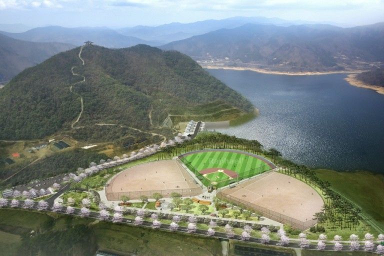 운문댐을 배경으로 하고 있는 청도 베이스볼 파크의 아름다운 전경.[사진=청도군]