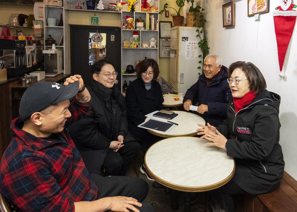 박희영 용산구청장이 해방촌 카페에서 상인들 애로사항을 듣고 있다.