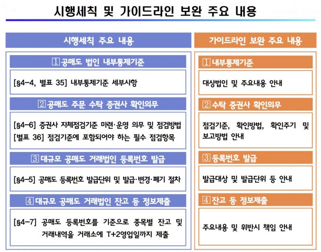이날 금융감독원과 한국거래소는 '금융투자업규정 시행세칙' 등 개정을 사전 예고하고 공매도 통합 가이드라인을 배포했다. 개정 시행세칙 주요 내용은 ▲공매도 법인 내부통제기준 ▲공매도 주문 수탁 증권사 확인 의무 ▲대규모 공매도 거래법인 등록번호 발급 ▲대규모 공매도 거래법인 잔고 등 정보 제출 등이다. 또한 내부통제 기준, 수탁 증권사 확인의무, 등록번호 발급, 잔고 등 정보제출 등의 가이드라인 내용을 보완했다.