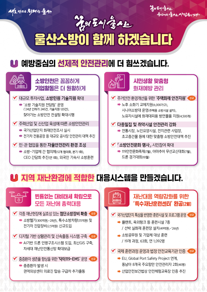 울산시 소방본부는 시민들의 안전을 보장하고, 지역 산업과 조화를 이루는 안전도시를 실현하고자 2025년 한 해 동안 다양한 사업을 추진한다.