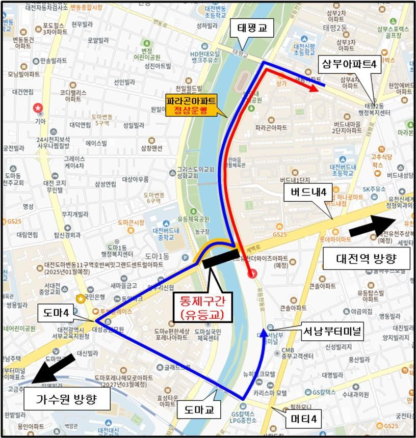 대전시는 유등교 가설 교량이 부분 개통됨에 따라 유천동~태평교~도마동으로 우회 운행하던 일부 노선을 24일부터 유천동~유등교 가설 교량~도마동으로 단축 운행한다고 밝혔다.
