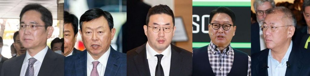 (왼쪽부터) 이재용 삼성전자 회장, 신동빈 롯데그룹 회장, 구광모 LG그룹 회장, 최태원 SK그룹 회장, 정의선 현대자동차그룹 회장. 사진출처=아시아경제 DB