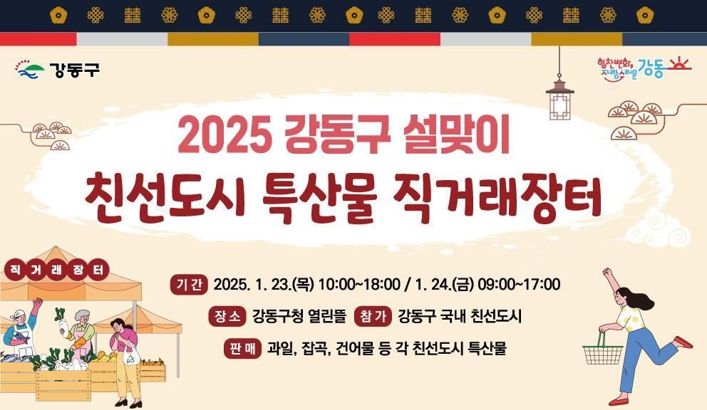 서울 강동구(이수희 구청장)는 설을 맞이해 이달 23~24일 ‘친선도시 특산물 직거래장터’를 강동구청 열린뜰에서 연다.
