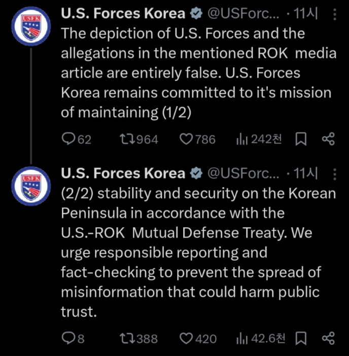 20일 주한미군은 공식 엑스(X·옛 트위터)를 통해 "한국의 한 언론사에서 언급된 주한미군 관련 내용은 완전한 거짓이다. 주한미군은 한미상호방위조약에 따라 한반도의 안정과 안보를 유지하는 데 전념하고 있다"라고 밝혔다. 이어 "국민의 신뢰를 깨뜨릴 수 있는 잘못된 정보의 확산을 방지하기 위해 책임 있는 보도와 사실 확인을 촉구한다"고 강조했다.