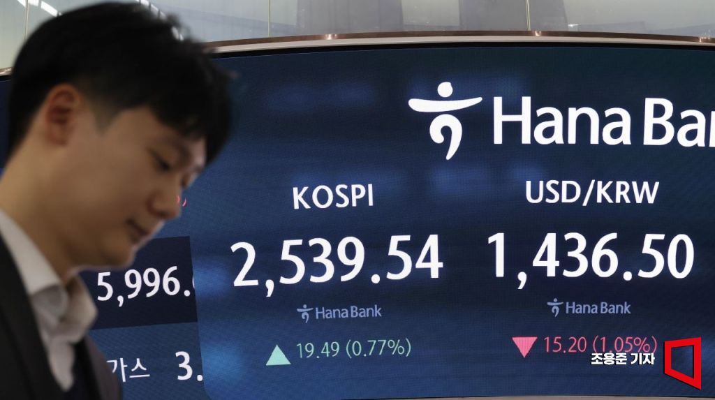 미국 도널드 트럼프 2기 행정부가 출범한 21일 서울 중구 하나은행 딜링룸 현황판에 원/달러 환율과 코스피 지수 등이 표시되고 있다. 이날 코스피는 전장보다 13.18포인트(0.52%) 오른 2,533.23로, 코스닥은 0.91p(0.13%) 오른 728.57에, 원/달러 환율은 14.7원 내린 1,437.0원에 장을 시작했다. 조용준 기자
