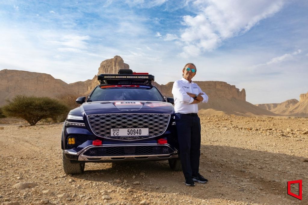 제네시스 브랜드는 브랜드 파트너 재키 익스가 '2025 다카르 랠리'에 명예 선수로 참가해 럭셔리 오프로더 'GV80 데저트 에디션'으로 사막 길을 6000km 이상 주행했다고 21일 밝혔다. 재키 익스가 GV80 데저트 에디션 앞에서 기념촬영을 하고 있다.(제공=제네시스)