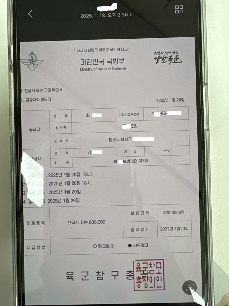 21일 제보자 등에 따르면 전남 영광군 영광읍에서 꽃집을 운영하는 A씨는 지난 20일 대한민국 육군 제2작전사령부 제31보병사단 예하 제96보병여단 3대대(과거 영광, 현재 나주 소재) 소속 김00 소위라고 소개한 남성으로부터 진급식에 사용할 화분 4개(개당 20만원)를 주문받았다. 여기에 시가 350여만원에 달하는 와인(샤도마고2015) 4병도 함께 준비해 줄 것을 별도로 요구받았다.