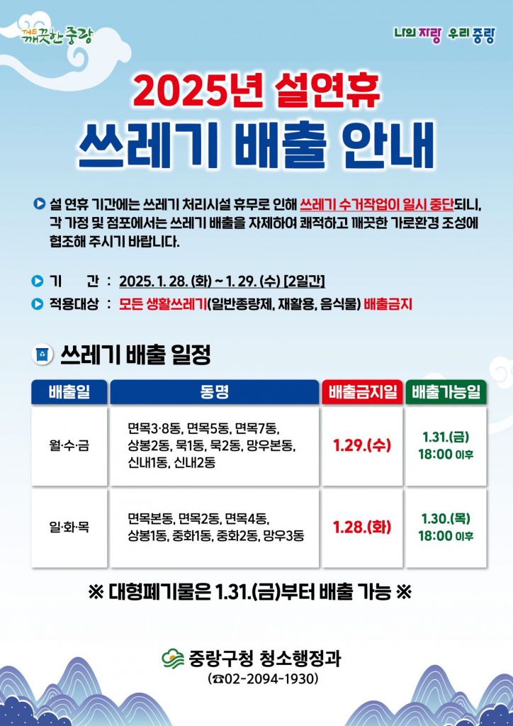중랑구(구청장 류경기)가 1월 25일부터 30일까지 이어지는 설 연휴 기간 동안 주민 불편을 최소화하기 위해 ‘설 연휴 쓰레기 처리 대책’을 마련해 추진한다.