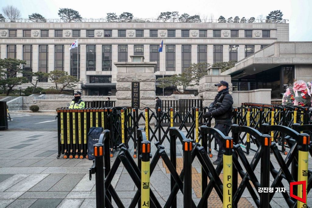 이날 헌재 주변은 윤 대통령 지지자들이 속속 몰려들면서 긴장이 고조되고 있다. 앞서 지난 19일 윤 대통령 극렬 지지자들이 서울서부지법을 습격해 판사실을 급습하고 법원 건물을 난장판으로 만든 일이 있었다. 사법사상 유례없는 참사다. 경찰은 헌재 주변에 64개 기동대, 4000여명을 배치한다. 헌재 정문과 내부에는 이중 경찰 저지선과 여러겹의 버스차벽이 설치돼 만일의 사태에 대비하고 있다.