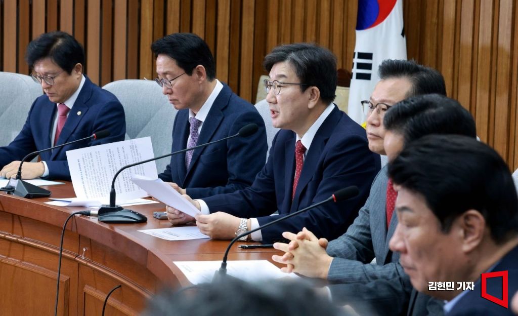 권성동 국민의힘 원내대표가 21일 국회에서 열린 원내대책회의에서 발언하고 있다.