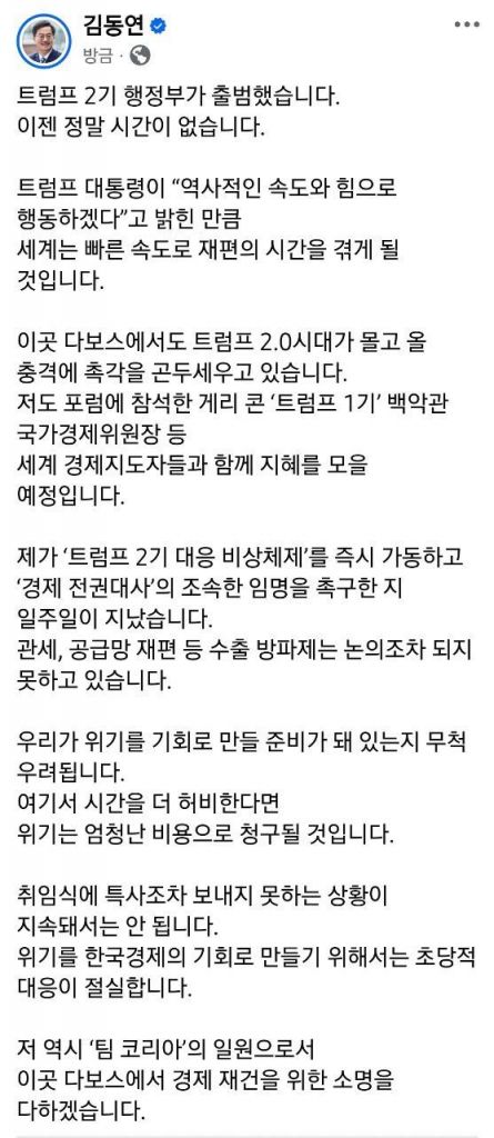 ‘다보스포럼’ 참석을 위해 지난 18일 출국한 김동연 지사는 21일 자신의 사회관계망서비스(SNS)에 올린 글에서 "트럼프 2기 행정부가 출범했다. 이젠 정말 시간이 없다"며 "트럼프 대통령이 ‘역사적인 속도와 힘으로 행동하겠다’고 밝힌 만큼 세계는 빠른 속도로 재편의 시간을 겪게 될 것"이라고 전망했다.