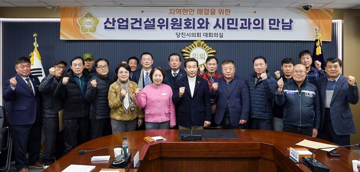 충남 당진시의회가 20일 시의회 대회의실에서 당진시 개인택시 관계자들과 간담회를 열고 시민불편 해소와 교통체계 개선 방안을 모색했다. 사진은 간담회 참석자들의 기념촬영 모습. /당진시의회