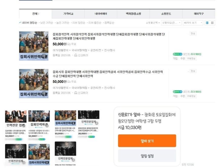 앞서 한 지역 생활 커뮤니티에도 '토요일 집회에 참여할 용모단정한 여학생을 구한다'며 시급 1만 30원을 내건 아르바이트 구인 글이 올라왔다가 삭제됐다. 이를 접한 누리꾼들은 "젊은 층이 없으니 돈으로 매수하나", "신속하게 조사해야 한다","대체 누가 저런 글을 올렸을까" "돈 받고 집회 참여한다는 게 헛소문이 아니었나 보다" 등의 반응을 보였다.