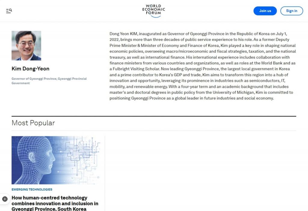 다보스포럼 홈페이지에 올라온 김동연 경기도지사의 기고문