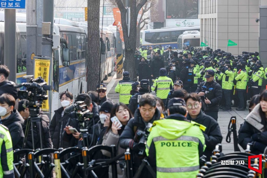 현장에 배치된 경찰 기동대원은 헬멧, 방패, 진압복을 착용하고 캡사이신 분사기를 준비하는 등 만일의 사태에 대비하고 있다. 헌재 주변엔 차벽이 겹겹이 쳐졌다.