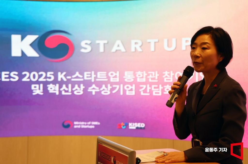 오영주 중기부 장관이 21일 서울 강남구 글로벌 스타트업 센터에서 열린 'CES 2025 K-스타트업 통합관 참여기업 및 혁신상 수상기업 간담회'에 참석해 인사말을 하고 있다. 윤동주 기자
