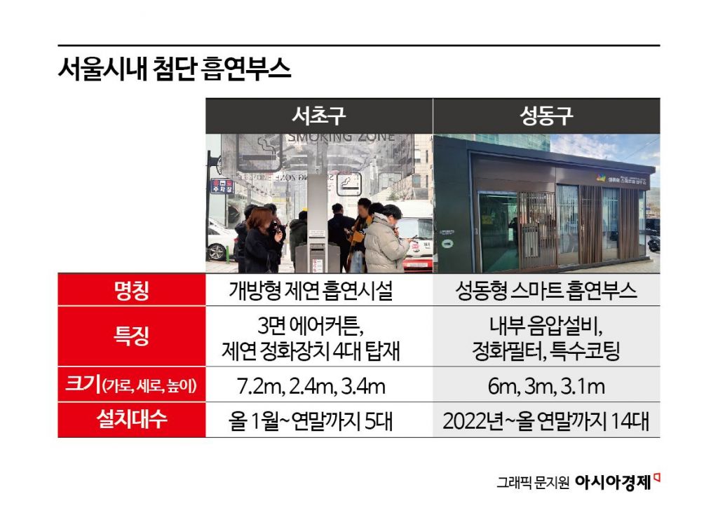 서울 구청들간 ‘흡연부스 첨단화 경쟁’이 벌어지고 있다. 서초구와 성동구가 앞장섰는데 공통 목표는 비흡연자 간접 흡연피해를 막고 흡연자 건강도 보호하자는 것이다.