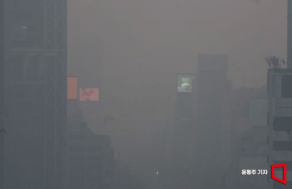 추위는 주춤하면서 전국의 미세먼지 농도 '나쁨'에서 '매우 나쁨' 수준까지 치솟은 21일 서울 도심이 뿌옇게 보이고 있다. 윤동주 기자