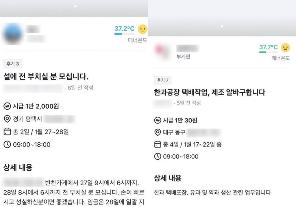이색적인 명절 일자리도 눈길을 끈다. '전 부치기 알바' , '한과 만들기 알바' 등이다. 차례상에 빠질 수 없는 음식을 만드는 사업장에서 설날 한정 단기 알바를 구하는 일자리 공고도 다수 찾아볼 수 있다. 설 연휴 동안 고향에 내려가거나 여행을 가는 등 집을 비워야 하는 이들이 반려동물 돌봄 구인에 나서기도 했다.