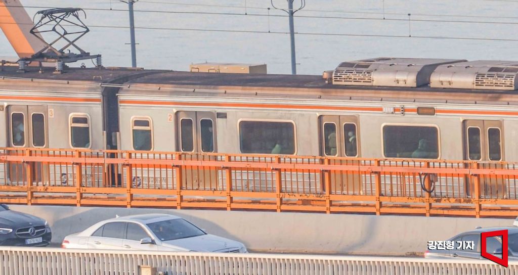 동호대교 위를 달리는 지하철에 시민들이 몸을 싣고 출근길에 오르고 있다. 강진형 기자