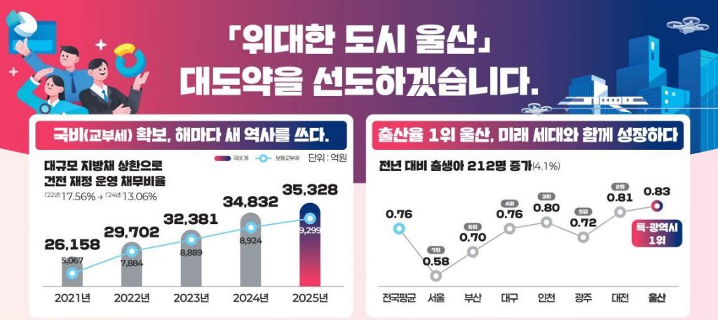 울산시 관계자는 “위대한 도시 울산 대도약을 실현하기 위해 정책과 사업을 체계적으로 추진하고 도시 경쟁력을 강화함과 동시에 시민의 삶의 질을 높이는 데 집중할 계획이다”라며 “미래 성장 기반을 확고히 다져 시민 모두가 행복한 지속 가능한 도시를 만들어 나가는 데 최선을 다하겠다”라고 말했다.