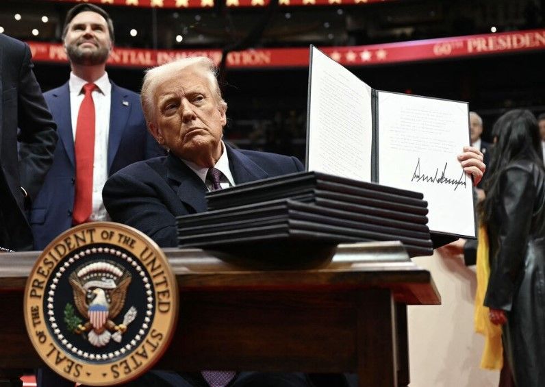도널드 트럼프 미국 대통령이 20일(현지시간) 미국 워싱턴D.C. 캐피털원 아레나에서 열린 취임 행사에서 방금 서명을 마친 행정명령을 들어올려 보이고 있다. (AFP·연합뉴스)