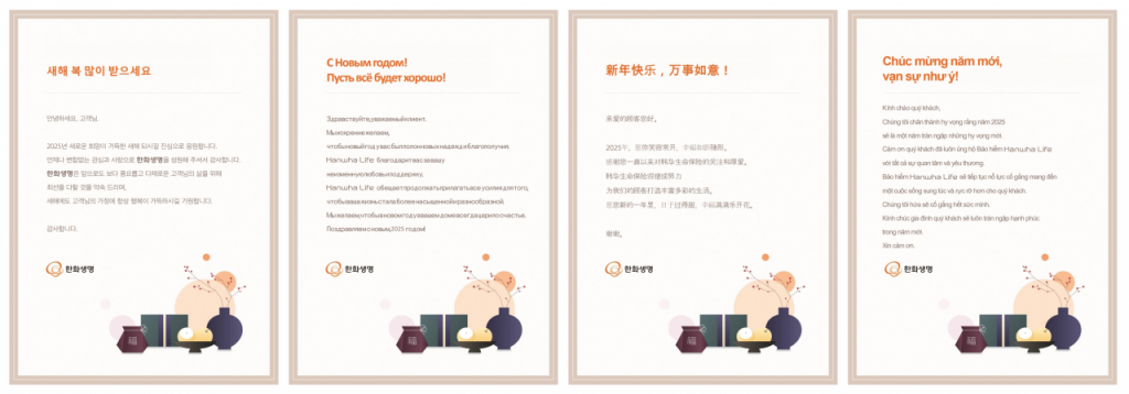 한화생명이 설 명절을 앞두고 외국인과 귀화자를 비롯해 다양한 지역적·문화적 배경을 지닌 고객에게 전할 다국어 연하장을 선보였다. 왼쪽부터 한국어, 러시아어, 중국어, 베트남어. 한화생명 제공
