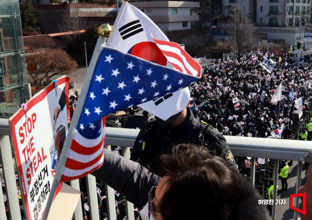 지난 1월 3일 아침 윤석열 대통령에 대한 체포영장 집행을 위해 공수처 관계자들이 서울 한남동 대통령 관저에 들어간 가운데 윤 대통령 지지자들이 관저 근처 집회장으로 가면서 태극기와 성조기, 부정선거 검증을 촉구하는 손팻말을 들고 구호를 외치고 있다. 허영한 기자