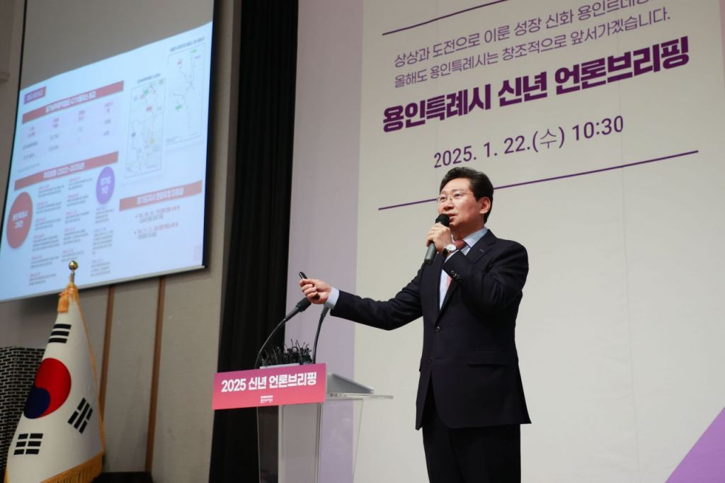 이상일 용인시장이 22일 신년 언론브리핑 도중 '경기남부광역철도'에 대한 자신의 입장을 설명하고 있다. 용인시 제공