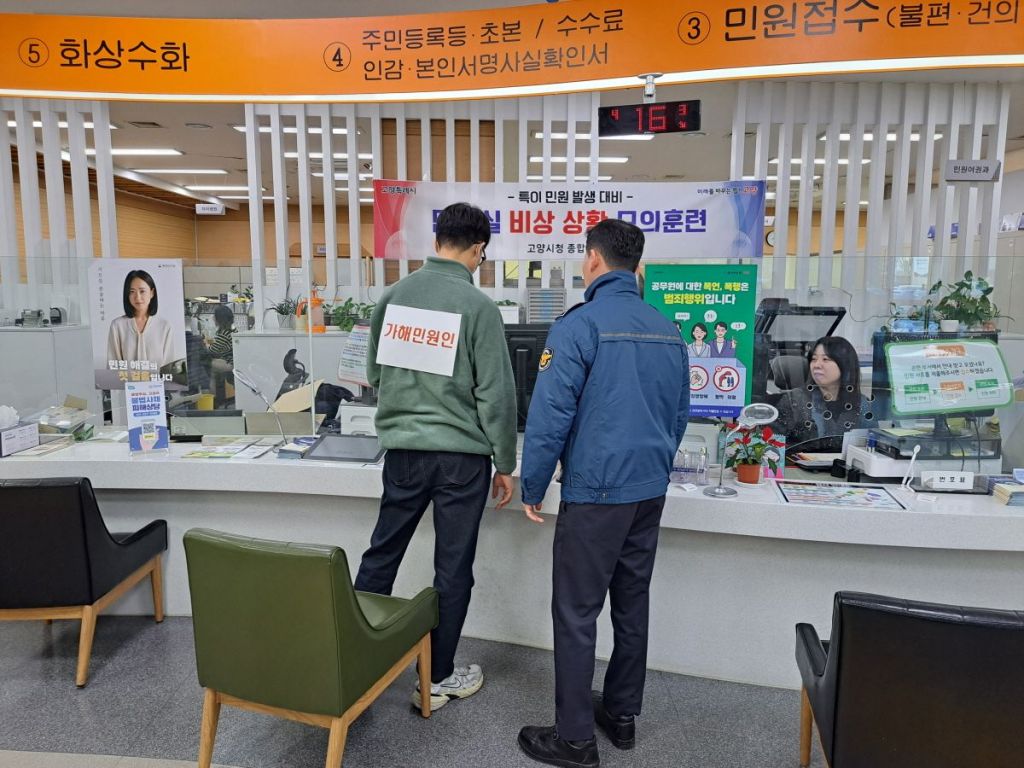 고양특례시가 지난 22일 시청 종합민원실에서 폭언·폭행 등 특이민원 관련 비상 상황에 대비해 ‘2025년 상반기 민원실 비상상황 대비 모의훈련’을 실시하고 있다. 고양특례시 제공