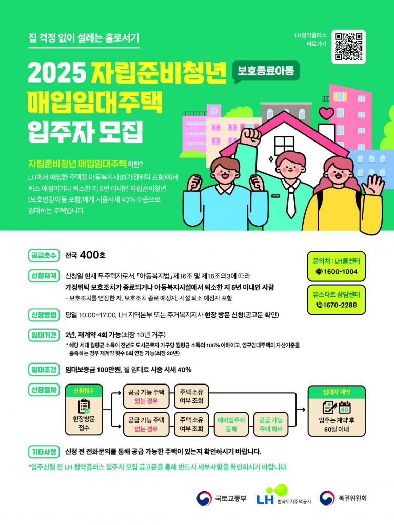 LH는 아동복지시설 등에서 퇴소하는 자립 준비 청년을 돕기 위해 청년 매입임대주택을 활용해 우선 공급해 왔다. 냉장고·세탁기 등을 갖췄으며 최장 10년까지 거주 가능하다. 보증금 100만원에 월세는 인근 시세의 40% 수준이다.