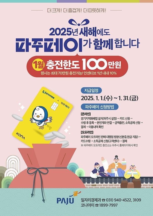 경기 파주시(시장 김경일)는 민족 대명절 설을 맞아 1월 한 달간 1인당 파주페이 충전 금액 한도를 보통 달에 비해 30만원 높은 100만원으로 상향 적용한다고 23일 밝혔다.