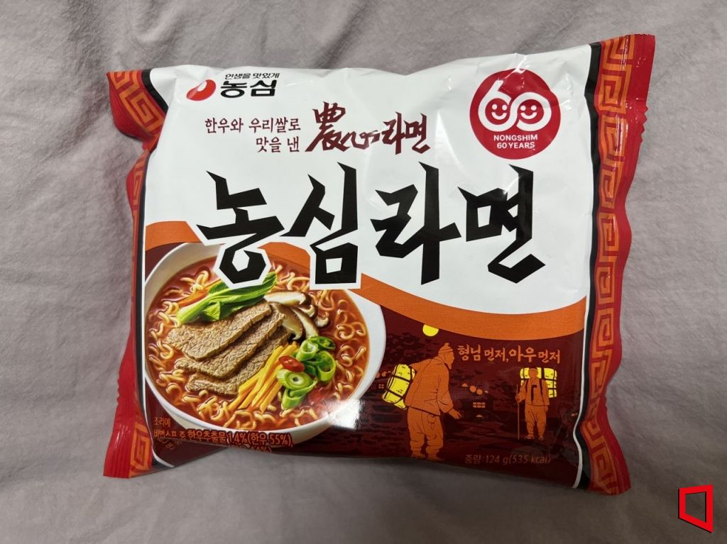 농심이 최근 재출시한 '농심라면'. 오른쪽 아래엔 '형님 먼저 아우 먼저'라는 과거 광고 카피가 그려져 있다. 한예주 기자