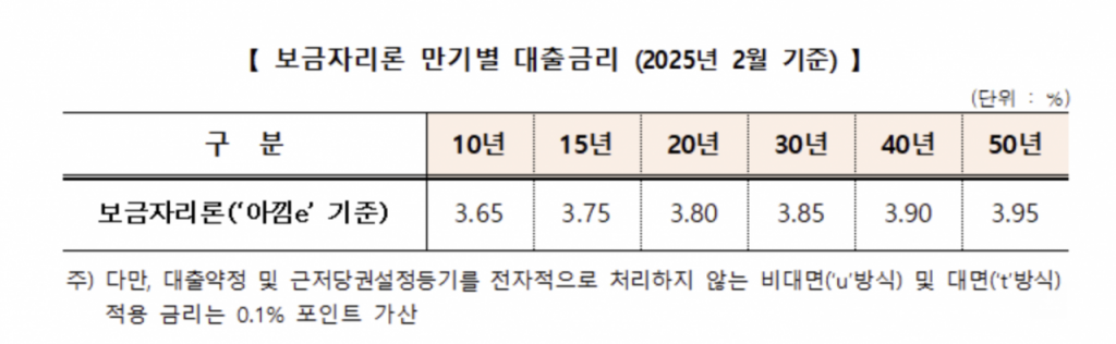 '아낌e-보금자리론' 기준으로 연 3.65(10년)~3.95%(50년)가 적용되며, 저소득청년, 사회적배려층(장애인·한부모 가정 등) 및 전세사기피해자 등이 추가 우대금리(최대 1.0% 포인트)를 적용받을 경우, 최저 연 2.65(10년)~ 2.95%(50년) 금리가 적용된다.