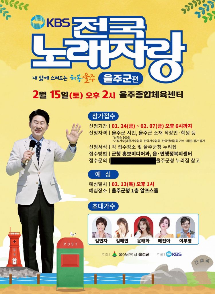 본선은 다음 달 15일 울주종합체육센터 2층 체육관에서 열린다. 김연자, 김혜연, 윤태화, 배진아, 이부영 등 초청가수 공연도 함께 펼쳐진다.