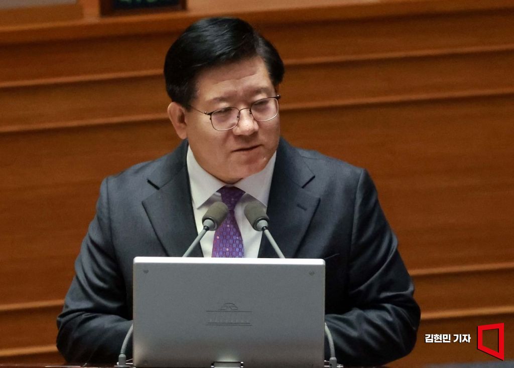 이호영 경찰청장 직무대행이 23일 국회 본회의에서 열린 '서울서부지법 난입 사태' 관련 긴급 현안질문에서 민형배 더불어민주당 의원의 질의에 답변하고 있다.